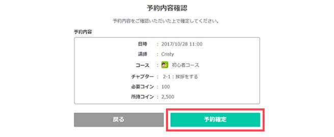 希望の日時と教材を選ぶと、予約内容確認が表示されます。