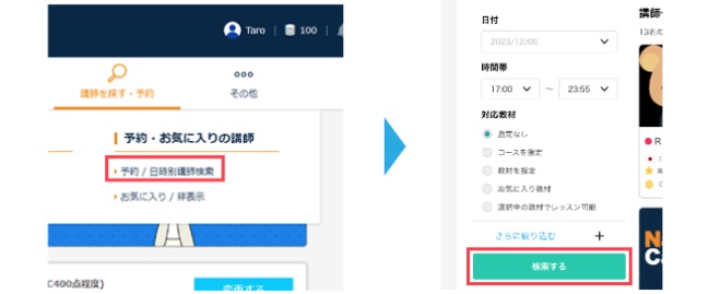 日付や時間などを選択して、レッスン可能な講師を検索しましょう。