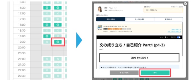 次に、レッスンで使用したい教材を選んで「次へ」をクリックしましょう。