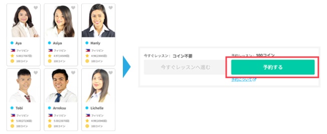 一覧の中から好きな講師を選んで、画面右側にある「予約する」をクリックしてください。