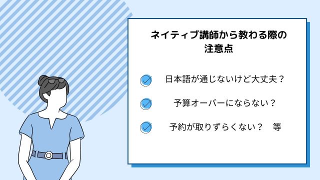 ネイティブ講師の場合、日本語のサポートを受けられないことを念頭に置き受講しましょう。