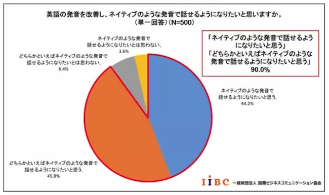 実際、一般社団法人国際コミュニケーション協会の調査によれば、英語を学んでいる方のうち90%の人が「ネイティブのような発音で話せるようになりたい」と思っているという結果が出ています。
