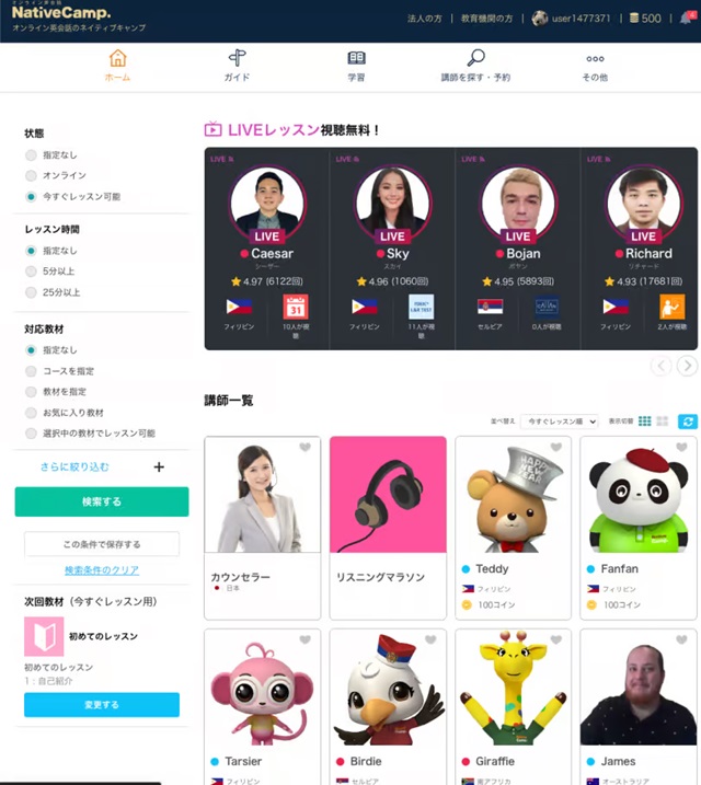 レッスンを受けるにはコインが必要ですが最初から500コイン付与されているため、希望する講師を選択してレッスンを受けることができます。